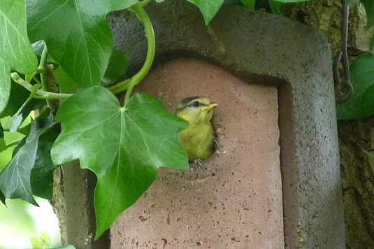 Eén van de drie nestkasten op het talud van de Strawinskylaan was dit jaar bezet door de pimpelmees. De jonge meesjes vlogen uit op 21 mei 2016. Op de foto één van de meesjes vlak voor het uitvliegen.