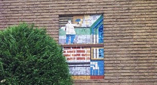 een versiering van een tegeltableau en beeldhouwwerk in de gevel.